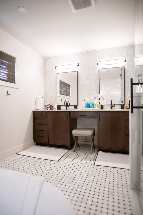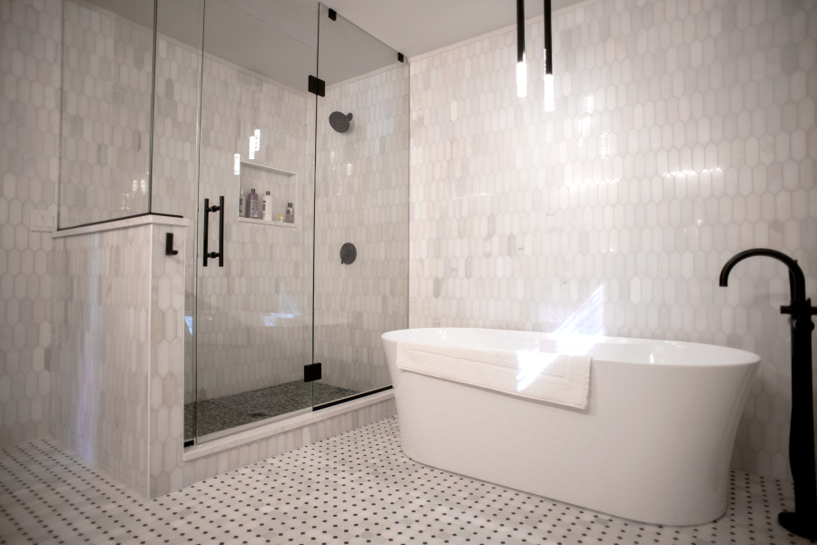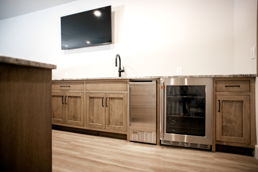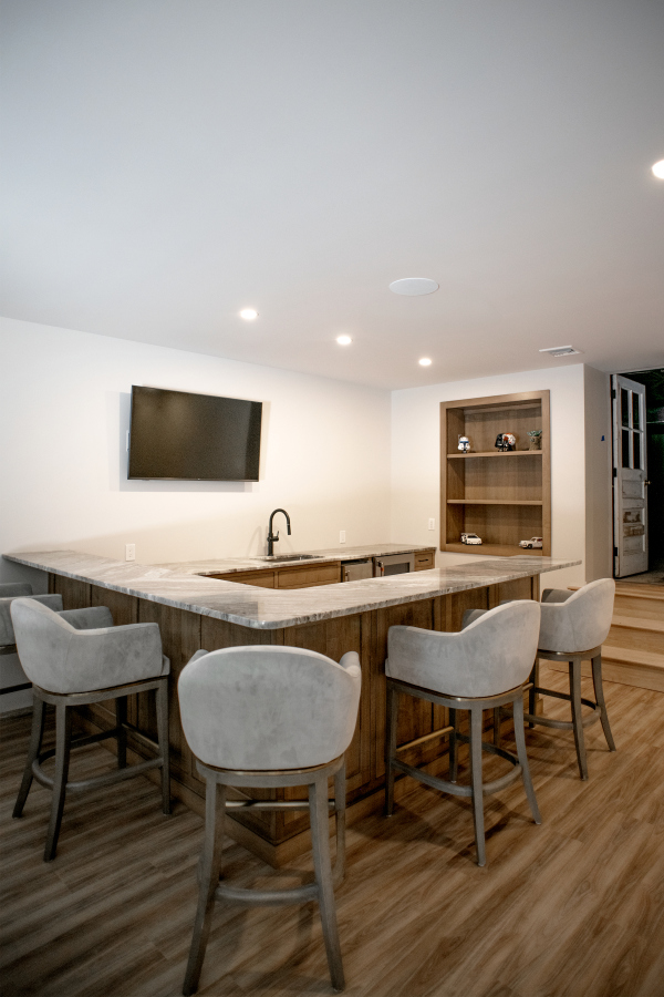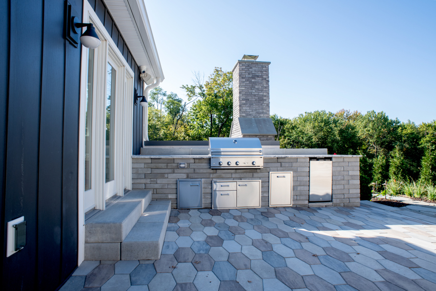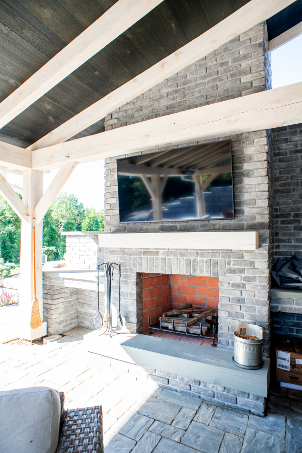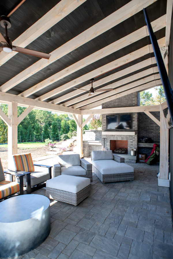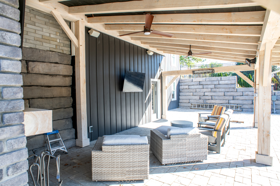 – Hardscaping, timber frames, flooring, countertops, and tile work by owner.