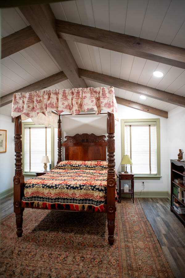 – Red Oak lock mitered wood beams in Classic Grey color for the master bedroom