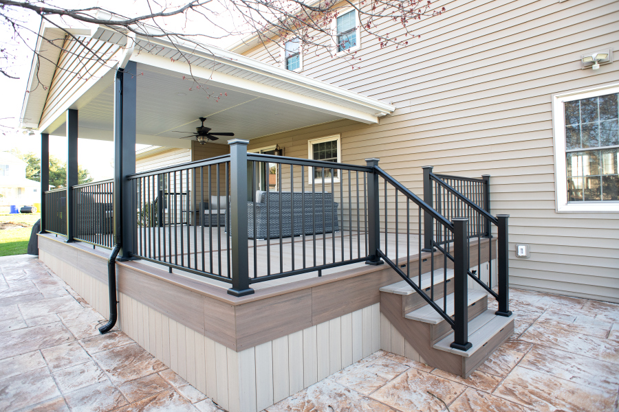 – 5.5″ TimberTech by Azek border, skirt board, and stair risers. Color: English Walnut